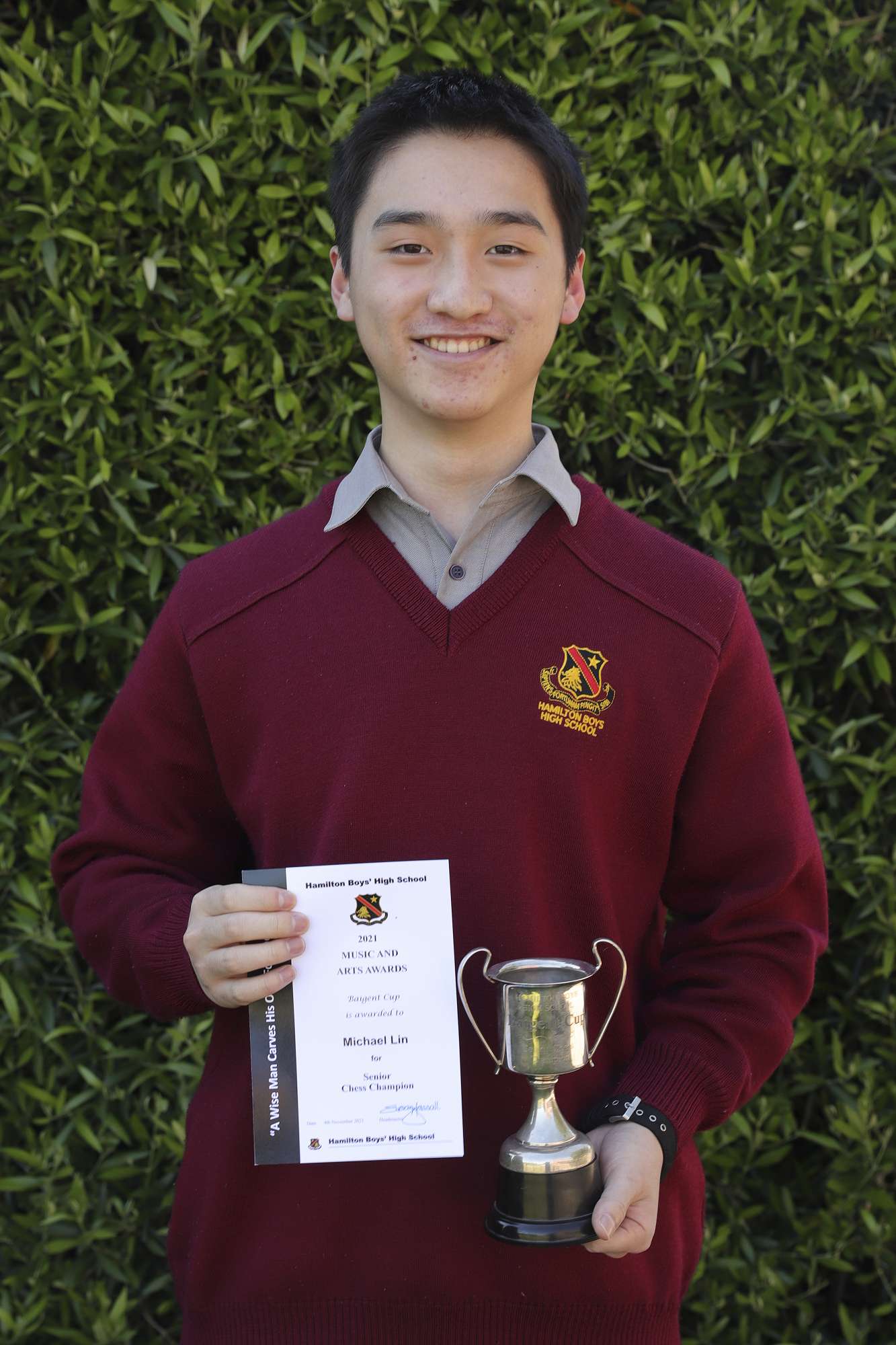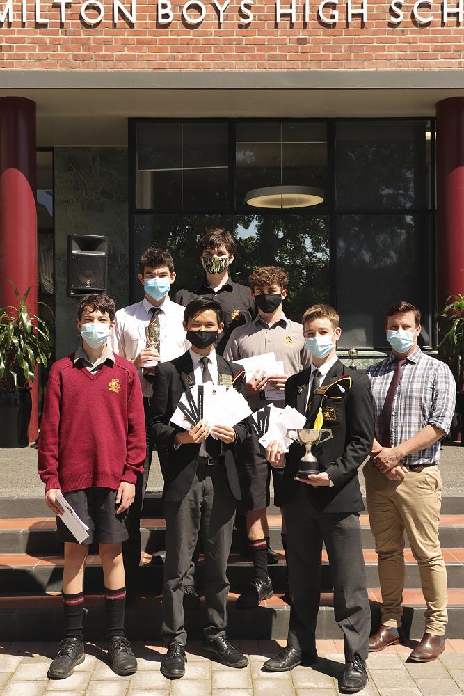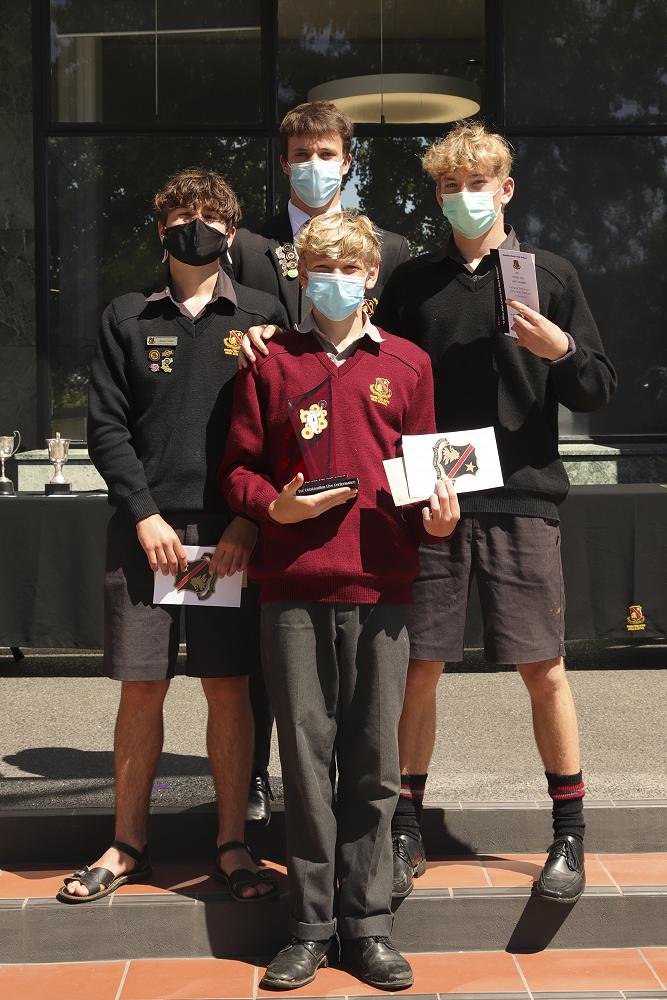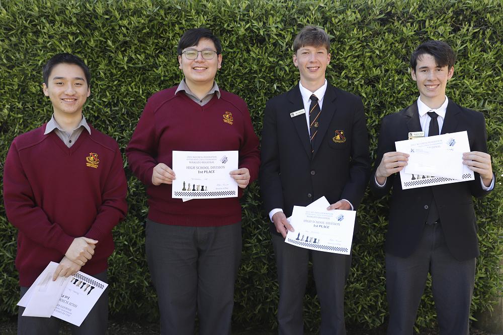 Super 8 Gold Badge recipients and first place team certificates from the 2021 New Zealand Chess Federation Interschool Chess Tournament, Waikato Regional Competition: Max Stephens, Michael Lin, Nathanael Loy, and Ben Wright.