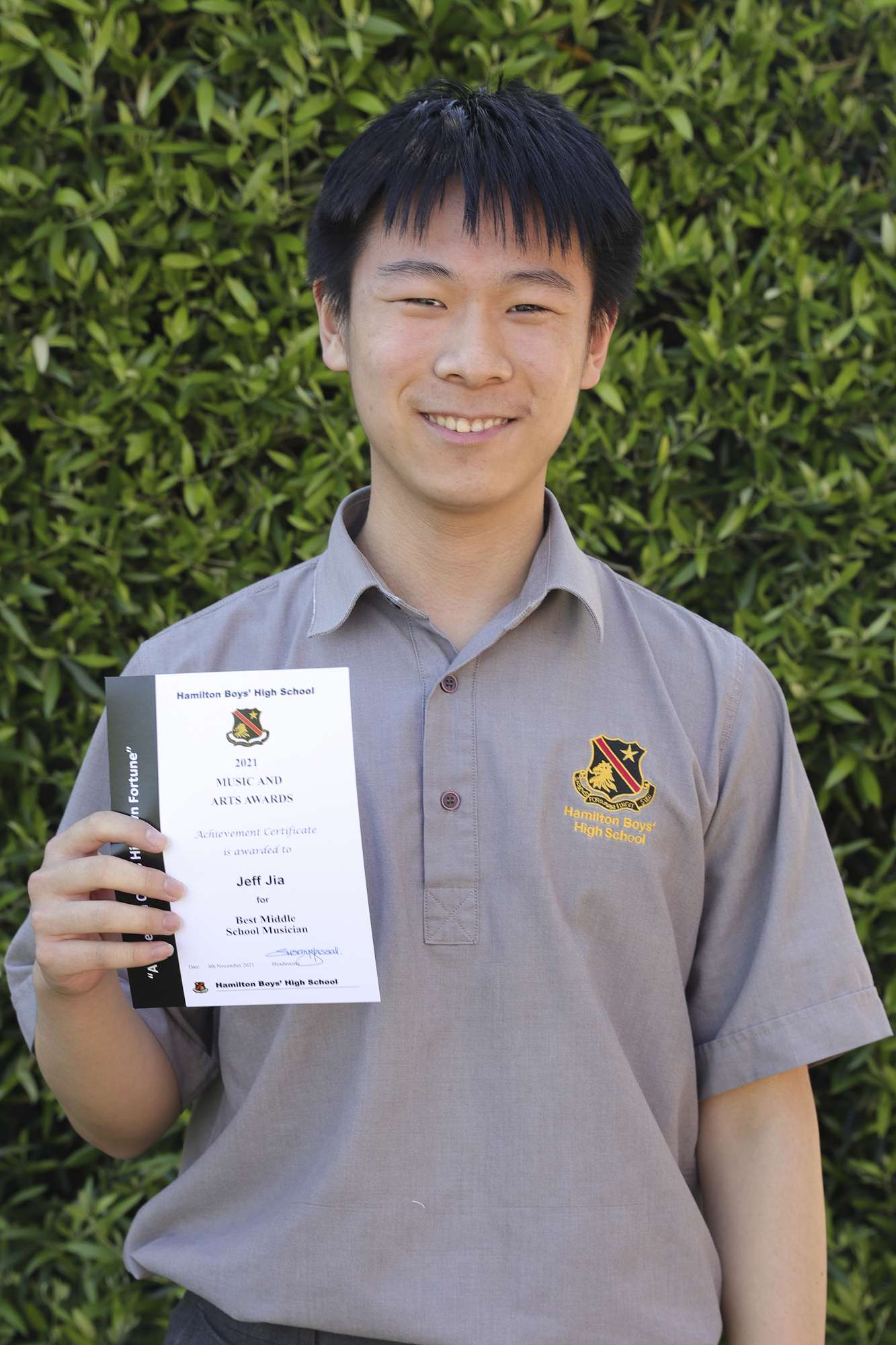 Achievement Certificate for Best Middle School Musician to Jeff Jia