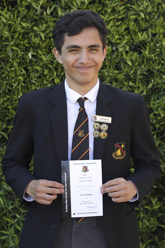 Achievement Certificate for Service to the Arts Award, in recognition of the student who has given the most service hours to events encompassing the arts, to Cole Gates