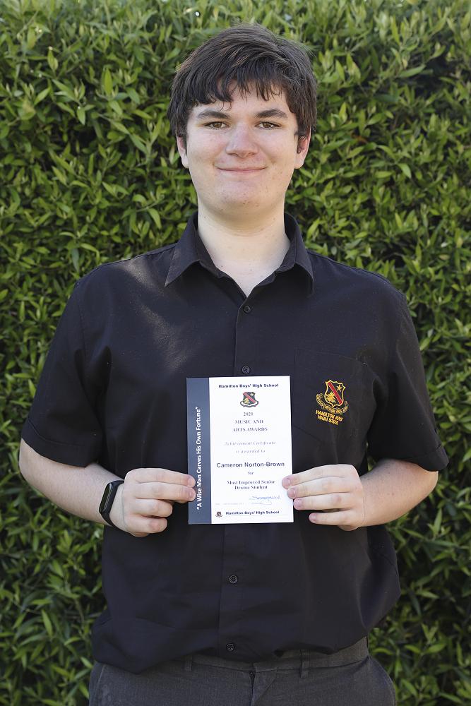 Achievement Certificate for Most Improved Senior Drama student to Cameron Norton-Brown