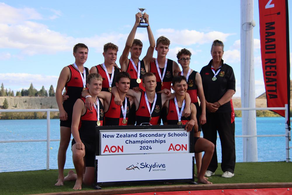 Jayden Ward, Runping Bai, Mareko Ratu, Finian Woollaston, Evan Hu, Gabriel King, Jack O'Connor, and Haylow Paraha-Senior (coxswain)