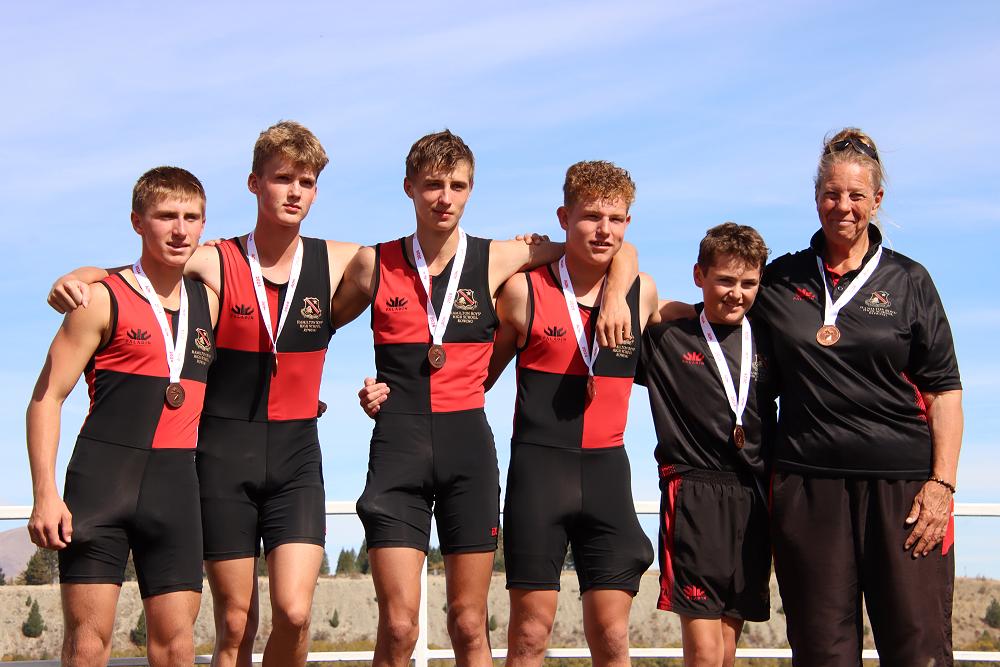 Jayden Ward, Finian Woollaston, Mareko Ratu, Runping Bai, and Haylow Paraha-Senior (coxswain)