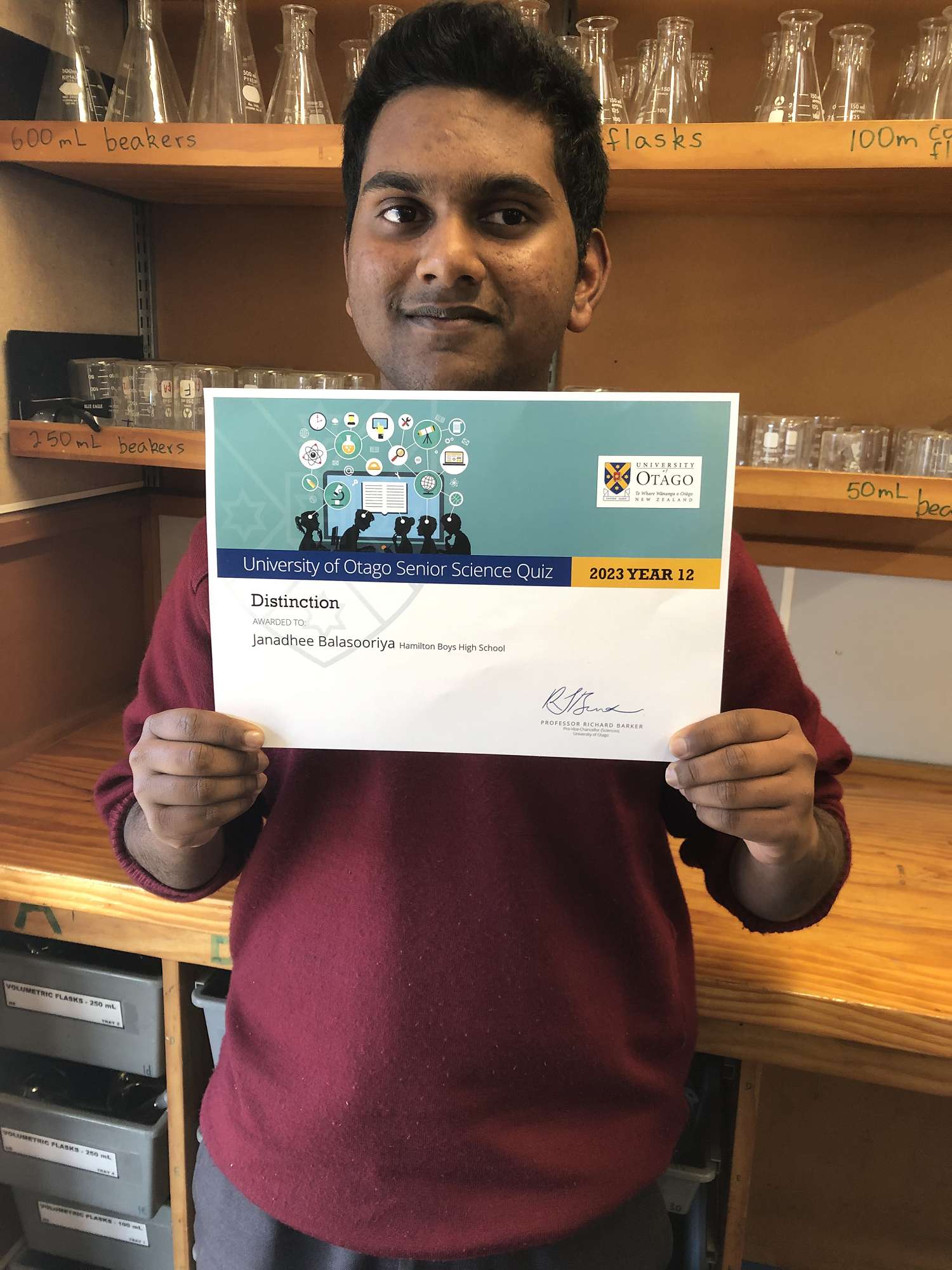 We had five Year 13 students participate in the International Chemistry Quiz. This year over 100,000 chemistry students participated from over 20 countries. Impressive results from our students (Ziyad Arif, Eddie Bi, Alex Liu, Alexander Mayo, and Samuel Priest) who all got High Distinction certificates (in the top 10% of their year). Alex Liu and Samuel Priest finished first and second in New Zealand, respectively. Four Year 12 students participated in the University of Otago Science Quiz. Congratulations to Janadhee Balasooriya for his Distinction award.