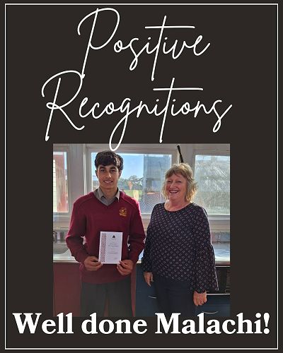 Congratulations also to Year 11 Malachi Johnston who was awarded a Positive Recognitions certificate for receiving 25 positive recognitions so far this year.