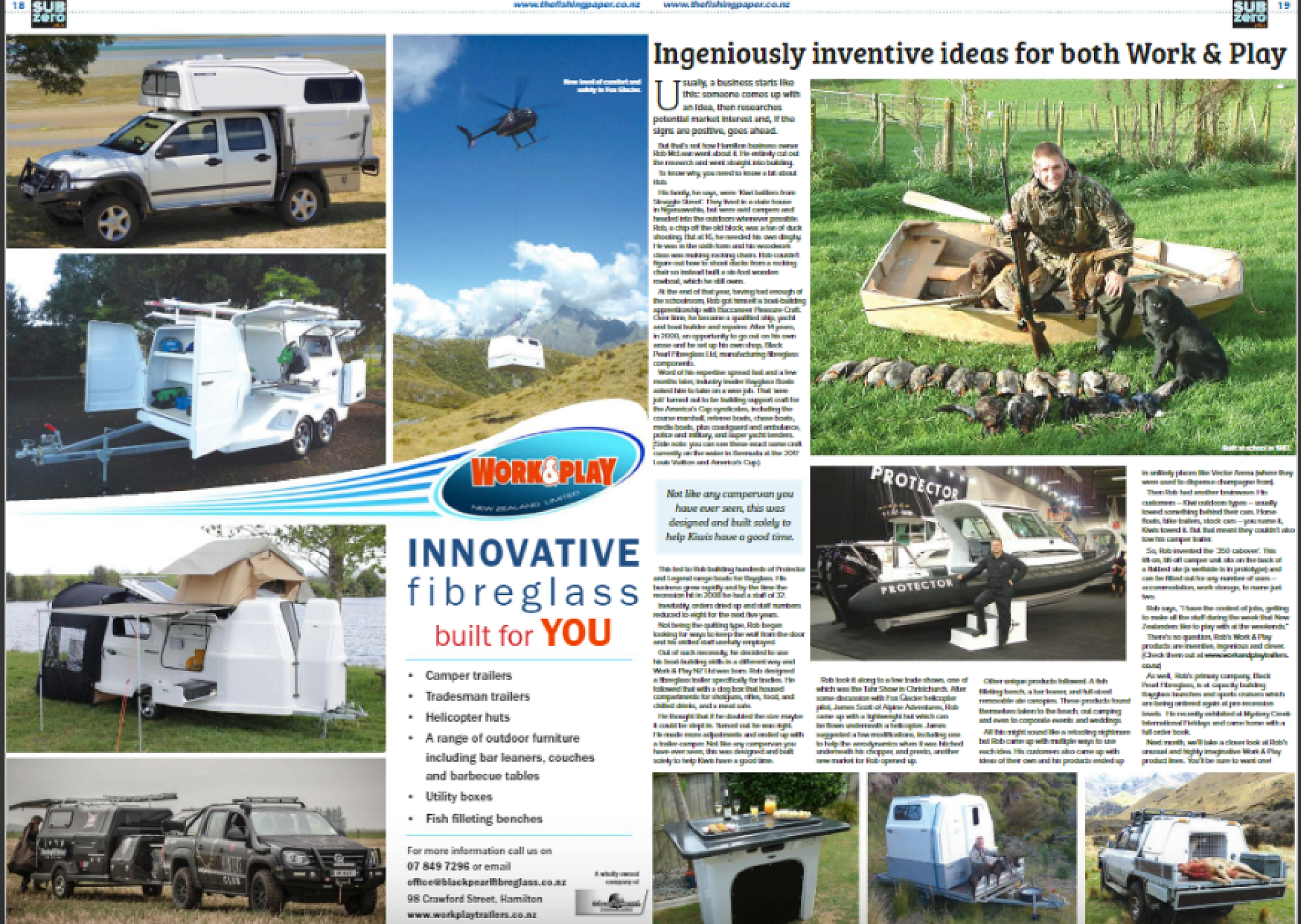 They produce and sell a variety of fibreglass products, including camper trailers, tradesman trailers, cab overs, helicopter huts, a range of outdoor furniture (bar leaners, couches and BBQ tables), utility boxes, fish filleting benches, and much more!