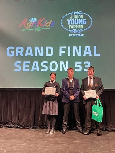 On Thursday the 1st July, our Young Farmers Club Chairperson Tim Lumsden headed to Christchurch for the FMG Junior Young Farmer of the Year National Competition. Earlier in the year, Tim and his team mate Tayla Hansen (from St Paul’s Collegiate), competed at the Waikato Bay of Plenty Regional competition and won. Out of 118 teams entered throughout the country, 14 teams competed in Christchurch over three days at the grand final, doing activities based around the agricultural sector. They completed an exam, gave a speech on New Zealand land use, did a practical “Farmlet” where they constructed a dog kennel and a farm gate, and completed modules which included filleting a salmon, identifying hazards, micro-organisms and pastures.