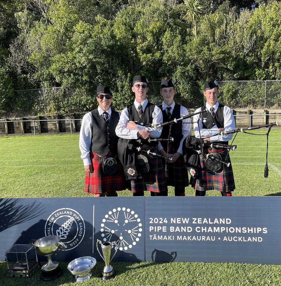 In March our pipe band students were in Auckland for the 2024 New Zealand National Pipe Band Championships, performing as members of the Hamilton Caledonian Pipe Band. Our pipe band students are National champions for 2024, having won all three of their competitions events. A perfect end to the season having won all five pipe band competitions leading up to the National Championships.