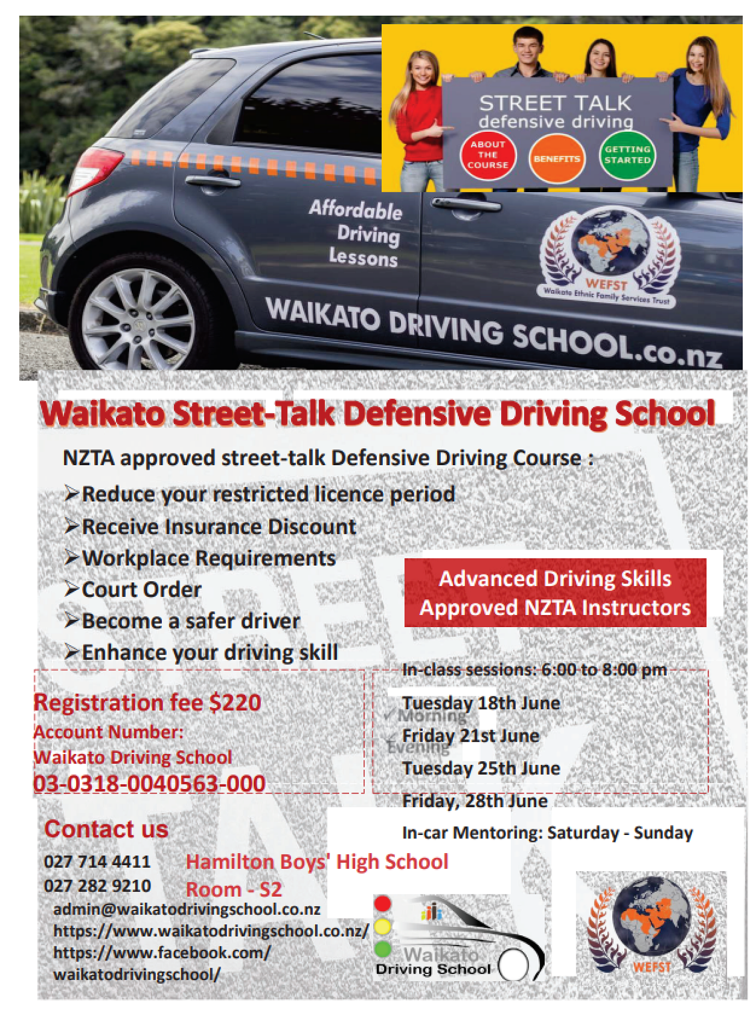 If you already have a restricted driver licence, you can complete a defensive driving programme. This will reduce the time required to sit the full licence from 18 months to 12 months. It should also ensure safer driving on our roads.The first course starts on June 18th at Hamilton Boys' High School. Please book directly through the company using the details below.