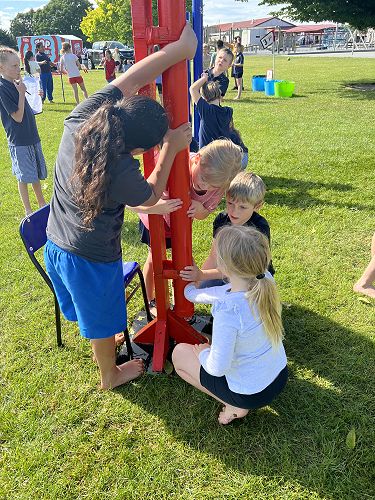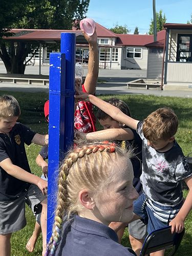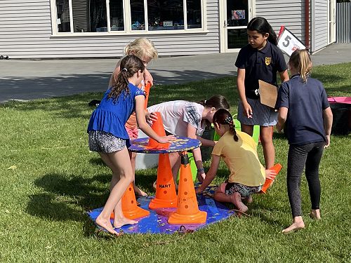 Top Team: The weather was kind to us today and the Year 3-6 children had an absolute blast! Top Team is run by Sport Canterbury and we were very grateful to Dylan for bringing this out to our school. Top Team is a fun team building physical activity with lots of water action.