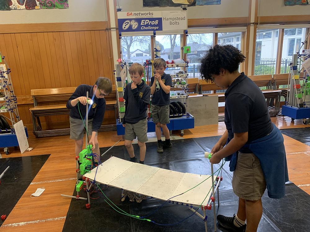 EPro8 Team: Hampstead Bolts - Alex, Cohen, Jack, Lucas (and mascot Tony) spent the afternoon at Intermediate yesterday competing against other Year 5/6 teams from different schools in Mid Canterbury. We were very proud of how the team worked together and represented Hampstead School beautifully. The EPro8 Challenge requires teams to work together, communicate well and problem-solve their way through a challenge, all while remaining cool under time pressure.