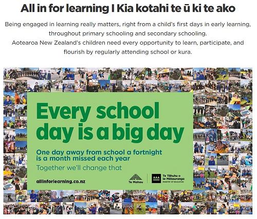 Attendance - Every day at School is a big day: Attending school regularly is so important for children's learning as well as their social development and wellbeing. The Ministry of Education consider regular attendance to be 90% and above (Graphic below from the Ministry of Education website). We are required to monitor all children's attendance and take action where non-attendance is unexplained or irregular. Our Attendance officer is Tania and she visits our school each morning and can support families with school attendance. If you have any concerns or would like support, please get in touch. More information can be found here: https://parents.education.govt.nz/primary-school/your-child-at-school/making-sure-your-child-attends-school-every-day/