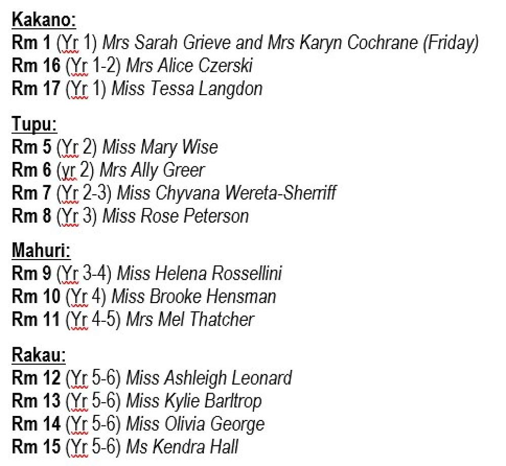 Classes for 2024: We are currently working on class placements for 2024. Below is a list of which teachers are in each class. Mrs Jen Williams as Junior DP will lead Kakano and Tupu roopu and will provide classroom release in those classrooms. Mrs Lois Eaton as Senior DP will lead Mahuri and Rakau roopu and provide classroom release in those classrooms. Mrs Robyn Dunne and Miss Casey McIntosh will have regular release teaching in our school also.