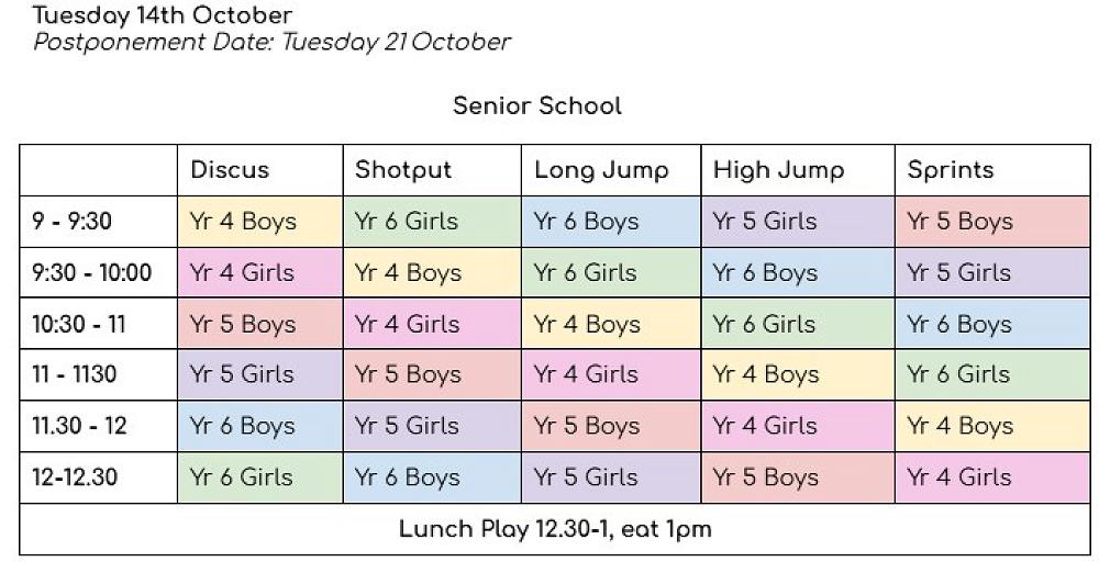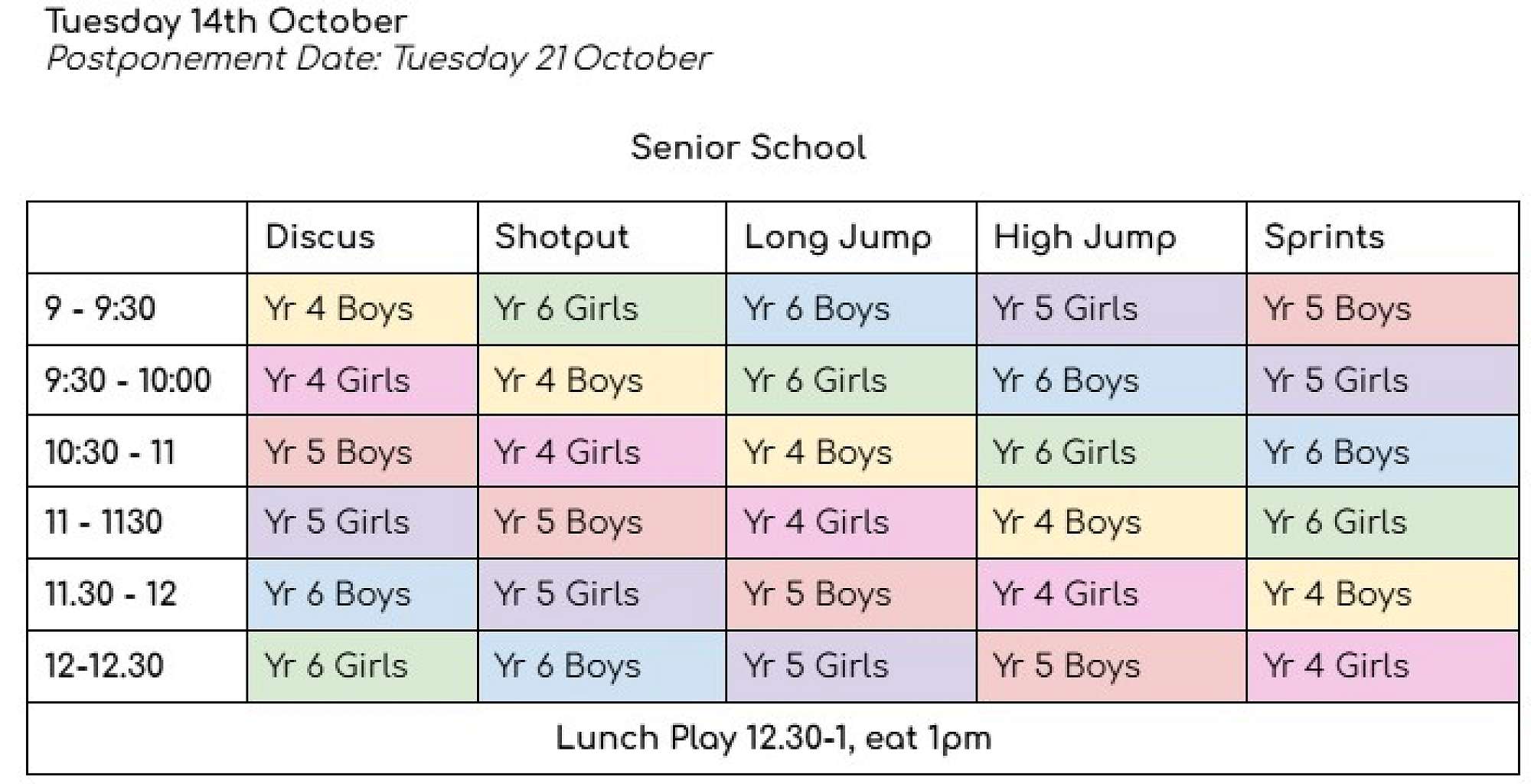 Athletics Day: We're excited to let you know about our upcoming Athletics Day, Tuesday 14th October! We'll be splitting the day into two blocks: Seniors (Yr 4-6) will have their events from 9:00 am to 12:30 pm, and Juniors (Yr 0-3) will enjoy a fun afternoon from 1:00 pm to 3:00 pm. This schedule will help us measure the seniors more efficiently before they potentially head to Counties, while also allowing for great progression and enjoyment for our juniors. Weather permitting, the senior long-distance run will take place the following Tuesday 21st October, followed by whole school fun class relays.