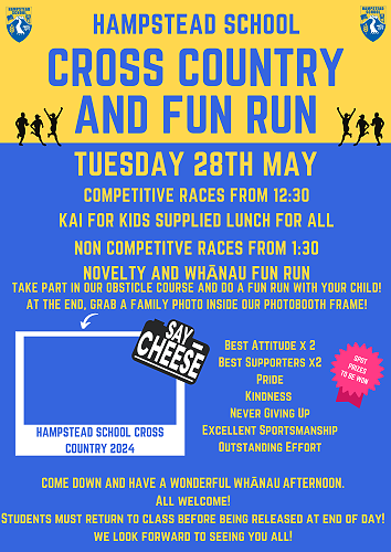 Kia ora e te whanau. Please see details above for our school Cross Country & Fun Run. We are so grateful to Kai for Kids for putting on a healthy kai for everyone. We hope you can make it along for lots of fun. We will all be in the middle of the field this year.