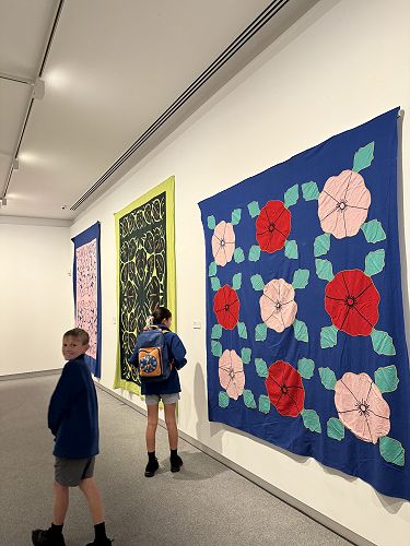 Last week the Senior classes all visited the Art Gallery where we saw some Pasifika art called Tivaevae. Many of the art works were very old. A couple of them were 100 years old or more. We were told how each piece of art was made and that every piece was hand stitched. After viewing the amazing art work and hearing about how the Tivaevae were made we then got a chance to create our own Tivaevae art with paper. These have all been collected to make our own art creation in our hall.