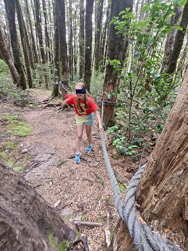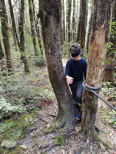After lunch, we met our camp instructor - Alex, who led us, along with Mr Campbell, on our first activity rotations - the sensory trail and making shelters. Both activities were lots of fun as well as providing a great opportunity to step up to one of our camp goals - accepting ‘challenge by choice’. During the sensory trail, the children followed a long rope over a bush trail while blindfolded. They needed to navigate up and down hills and over tree roots - all our children rose to this challenge incredibly well.