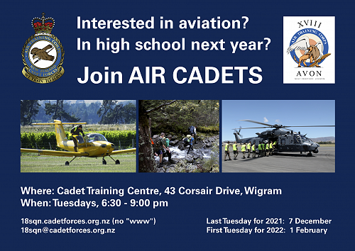 For further information about the Air Training Corps see https://www.cadetforces.org.nz/atc.html, email 18sqn@cadetforces.org.nz or come along on any Tuesday night.