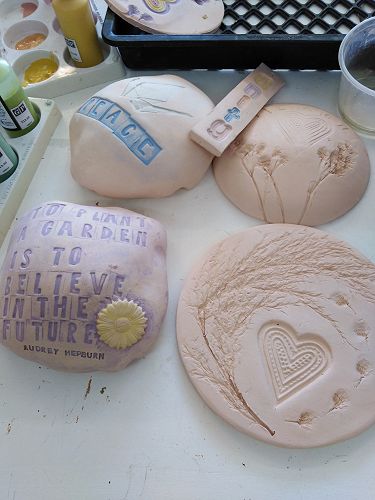 Rebecca's stories inspired us to design and make clay 'rocks' and decoration for the garden. When finished these will be taken to the Unity Garden. We were also inspired to make clay message rocks for the Heaton Gardens. Why not come and help us at Art Club.