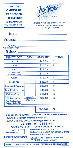 Photo order envelopes will be sent home this week. If you want to make an order, internet banking directly to the Heritage Productions bank account is the preferred method of payment so that cash is not held at school. Please return the order envelope back to the school office with the ID photo still attached. The closing date for orders is Friday, 3 March.