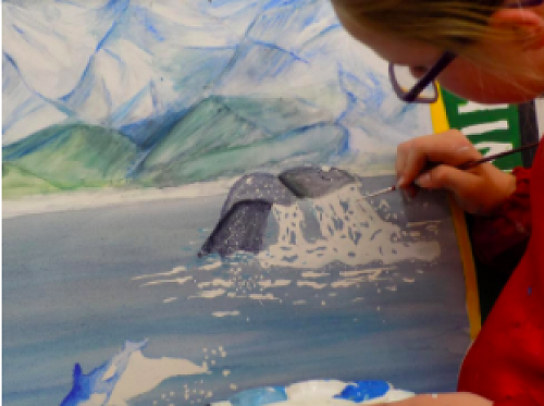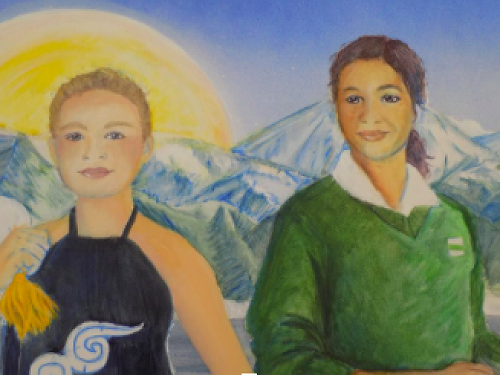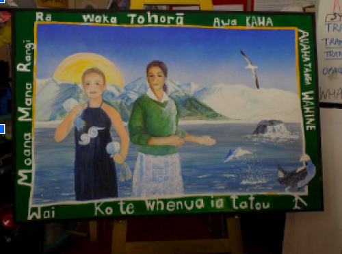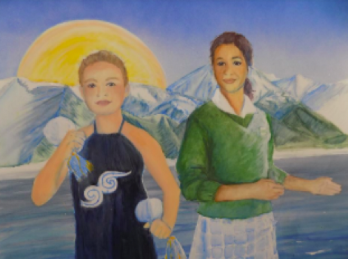 In our painting, you will see that the girls are dressed in school uniform and Kapa haka uniform. Their symbolic hand movements represent paddling and water. The models were Kate and Vera. The Whale, Tohorā, links the painting to the Korowai. The Tohorā whale fluke represents strength, intelligence, navigation through life and protection.