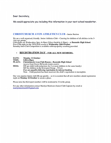 The club is taking registrations for junior coaching on 12th Sept. Meet