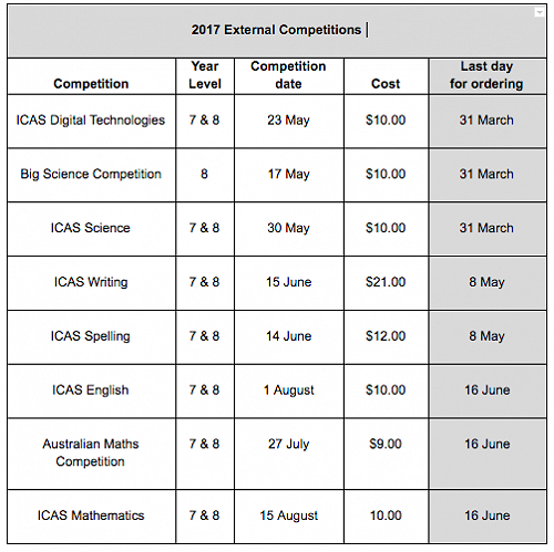 The 2017 External Competitions include ICAS English, Writing, Spelling, Mathematics, Digital Technologies, Science and Australian Mathematics Competition. In addition to this, Year 8 students are also able to participate in the Junior Big Science Competition.