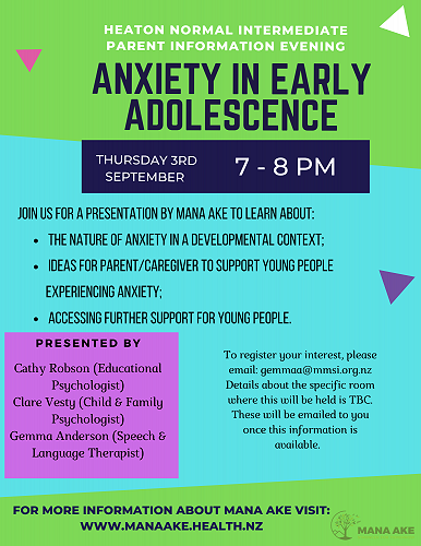 You will see the attached flyer about a parent information evening focusing on supporting young people when they experience anxiety. This will be held on Thursday, 3 September from 7-8pm. Please RSPV to the email address on the flyer. We will notify you of the venue which will be here at Heaton once we know the number of people who will be attending. After the presentations from the speakers there will be light refreshments available in the Heaton staffroom for those of you who would like to talk more about this very important topic or meet up with others.