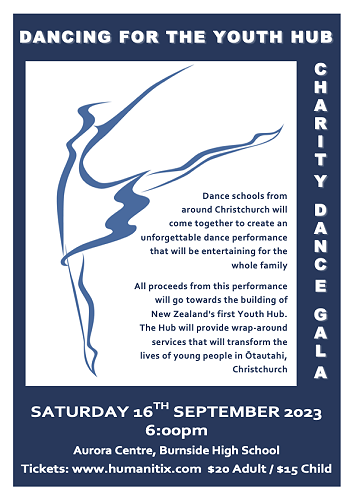 ‘Dancing for the Youth Hub’ - Charity Dance Gala.16th September, 6pm at the Aurora Centre, Burnside High SchoolJoin us for an entertaining evening of dance brought to you by leading dance schools from around Christchurch. The performance will contain a variety of dance styles including ballet, jazz and contemporary dance. All proceeds from the Gala will be donated to the new Youth Hub that is currently being built at 109 Salisbury St, Christchurch. The Youth Hub will provide everything young people need to improve and maintain their heath. It will deliver wrap-around services including mental health, medical, education, employment and training, recreation, creativity, social entrepreneurship and housing. By joining us for an entertaining evening of dance you will be directly supporting the creation of the Youth Hub and thereby helping to transform the lives of young people in Christchurch.Tickets are available through Humanitix - $20 adult and $15 child: www.humanitix.com