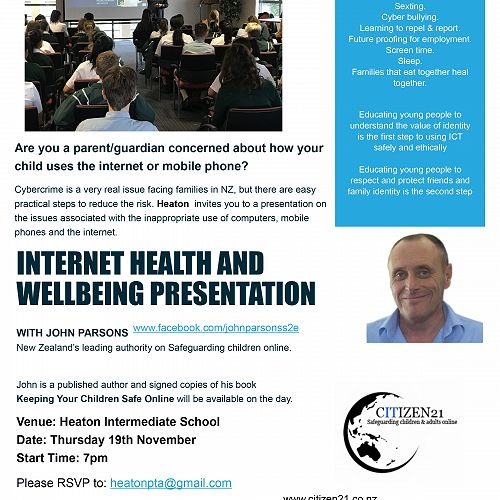 Thursday 19: John Parsons presentation for parents/whānau, 7.00 p.m., PAC, no cost