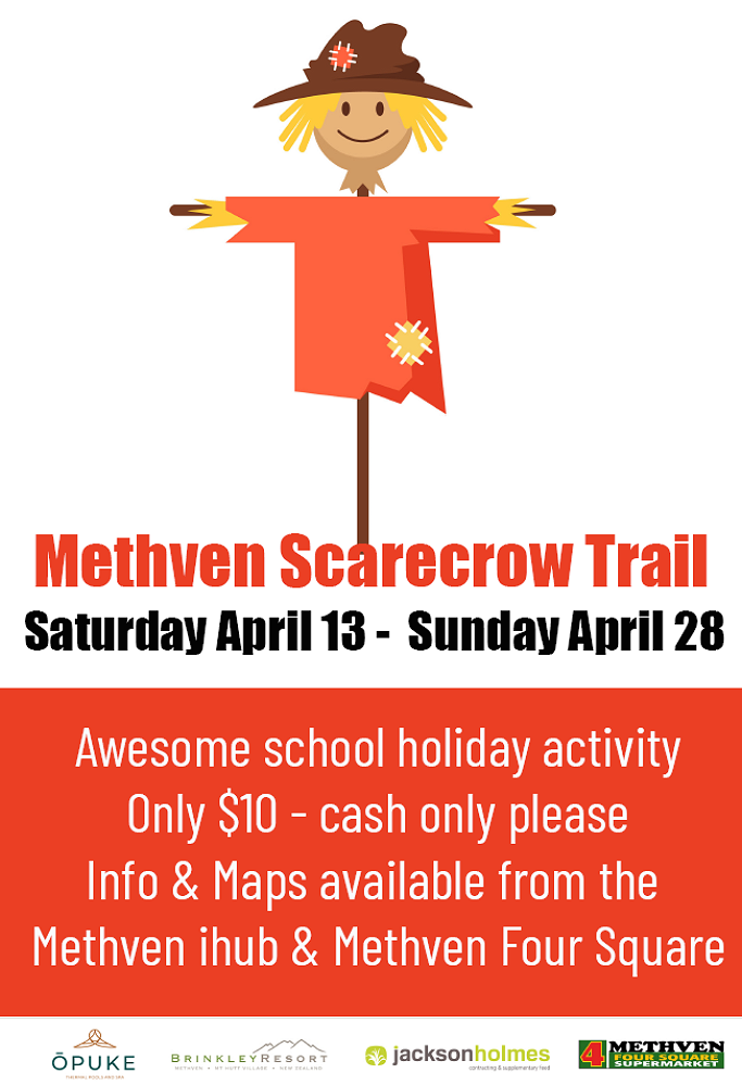 Every year, members of the Methven community build scarecrows to a particular theme and these scarecrows, usually around 30+ in number, are scattered around the town for families to find and try to identify the name of the character. This year's theme is Children's Movie - Animated Characters. Families or small groups purchase a Trail Map/Entry form from the iHub Information Centre and there are sponsored prizes for the most correct entries and for the most popular scarecrows.