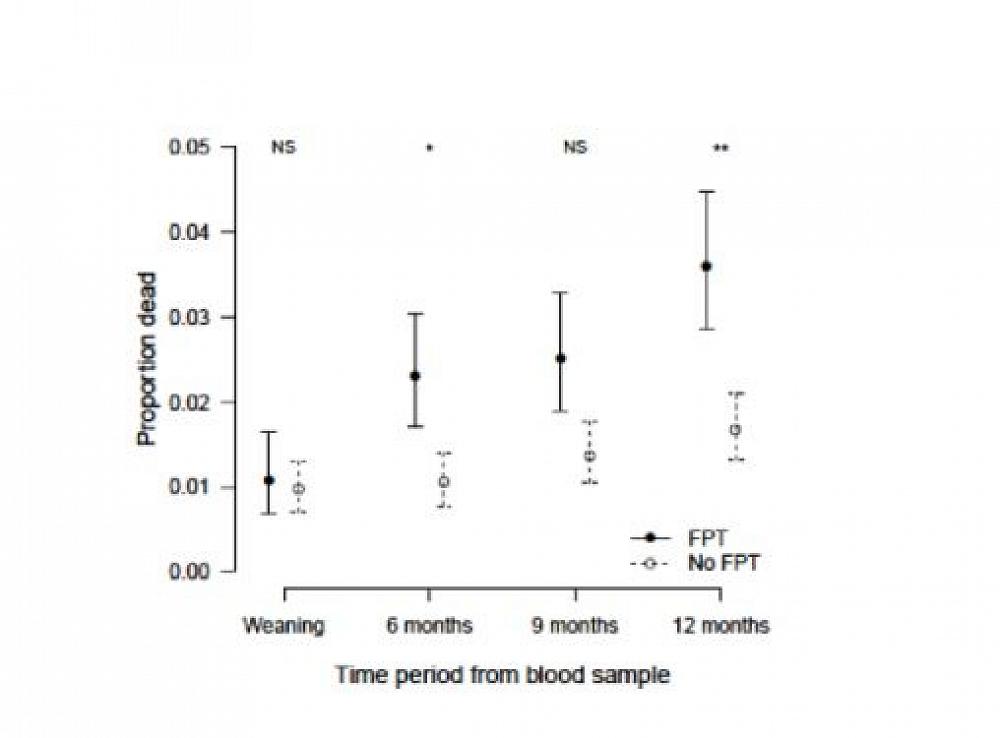 Surprisingly, mortality did not significantly differ pre-weaning; rather, the heightened mortality risk for FPT-affected calves occurred between 6 to 12 months of age (Figure 1). By 12 months, 3.5% of heifers that had FPT as calves had a died, whereas those that did not have FPT had a mortality rate of 1.8%.