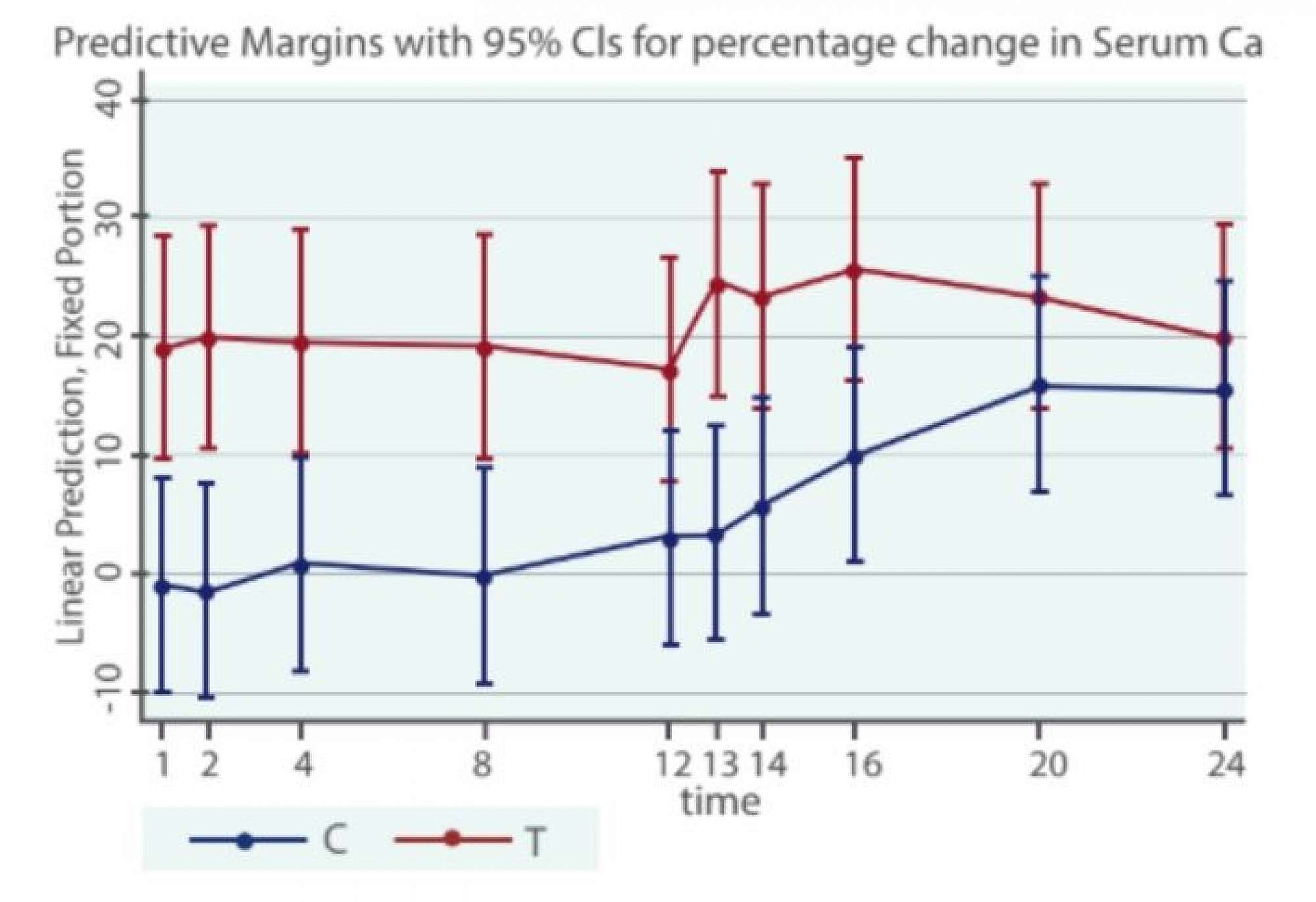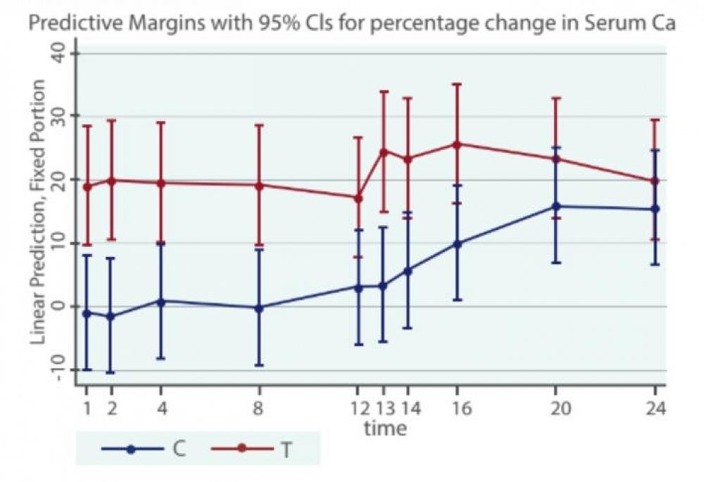 Table: Difference in serum calcium levels in Control (blue) vs Calpro bolus treated (red) groups