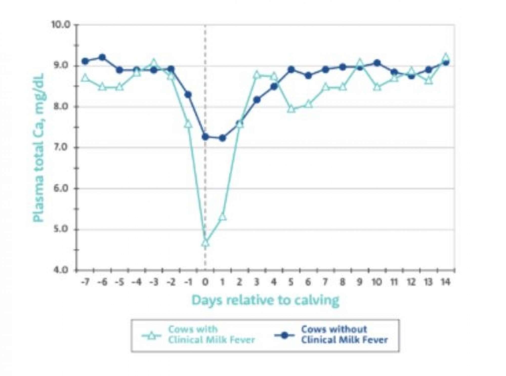 Calcium has several important roles inside the cow, including the mineralisation of bone and the correct functioning of muscles. The sudden increased requirement for calcium around calving will lead to a measurable fall in blood calcium, referred to as hypocalcemia. So to some extent there is a natural dip in calcium occuring around the time of calving no matter what. However it is the extend of the dip and the length of time of the dip that determines if a cow develops clinical hypocalcemia (milk fever), leading to increasing paralysis of muscles, or if she has a sub-clinical form of hypocalcemia where blood calcium levels only just drop below adequate levels without showing too many obvious signs in the cow’s appearance.