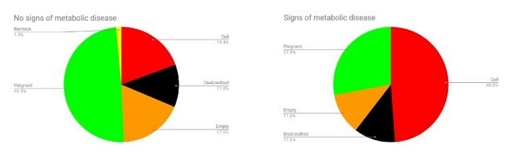 Another major effect on the final outcome was whether the cow was showing signs of metabolic disease, with 20% less metabolic cows in calf compared to non-metabolic cows. This makes sense with the plethora of research available on the effects of sub-clinical ketosis and milk fever on reproductive performance and milk production throughout lactation. So if you noticed a number of cows with signs of metabolic disease at calving (remembering that the cases you see are only the tip of the iceberg for subclinical disease), it is worthwhile calling us to discuss management options for this season.