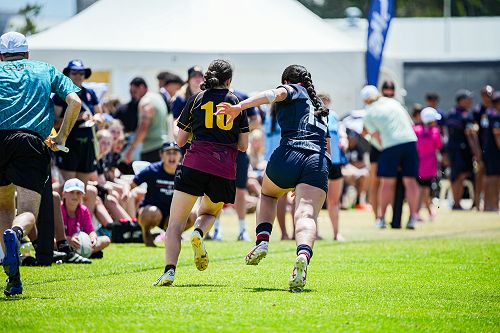 The team started strong with a dominant win against Otumoetai, 36-0. Their next game was a tough battle against Fielding, where the team narrowly lost 19-28. The team had to win their final pool game against Mount Albert Grammar to progress to the quarter-finals. This was an incredibly hard fought match between the two teams that ended in a 12-12 draw. Hamilton Girls' advanced on points, which placed the team second in their pool and secured a place in the quarter-finals.