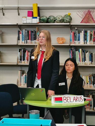 A day of problem solving and critical thinking lay ahead for the two-to-three-member teams as they arrived in the library, dressed in their best business attire. They had been assigned United Nations member countries to represent at the full-day Model UN, with time in advance to research their country’s political positions. All decisions, opinions and negotiating strategies had to be made based on the political priorities of their assigned countries, which was a good challenge for some!