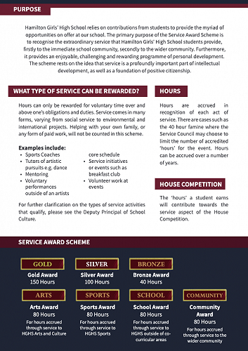 The Service Awards Scheme endeavours to acknowledge students who have given extraordinary service to HGHS and the community. As the graphics explain, awards are given for service to particular areas of the school, and a culmination of hours sees our students awarded with overall Bronze, Silver and Gold awards.