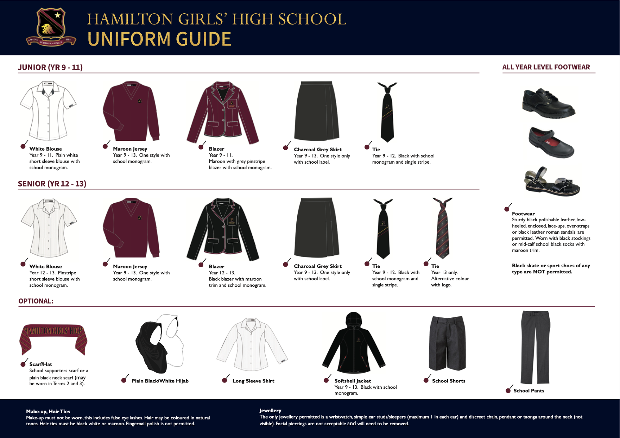 Make-up & Hair Ties: Make-up must not be worn. Hair may be coloured in natural tones. Hair accessories must be black, white or maroon. Nail polish is not permitted.