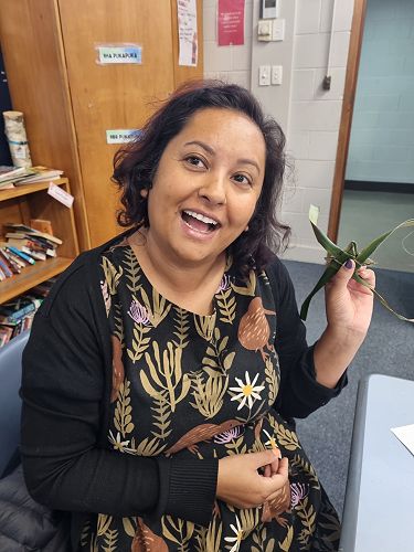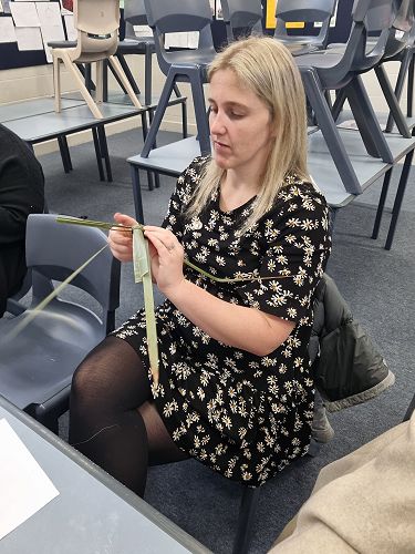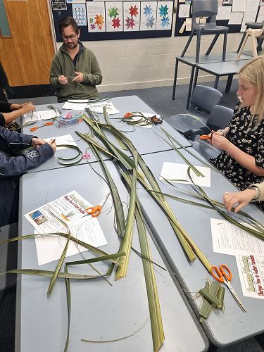 The Mana Ōrite mō te Mātauranga Māori staff PLD group were joined this morning by Miss Lisa Campbell, who led the group through the process of cutting harakeke and weaving the strips into stars for Matariki.