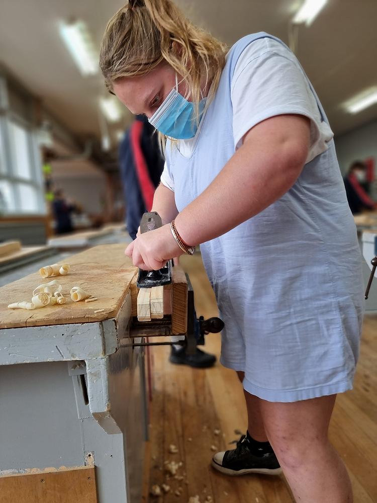 Chantelle from the Upland Transition Class using a plane as part of her folding stool project with a mainstream class.