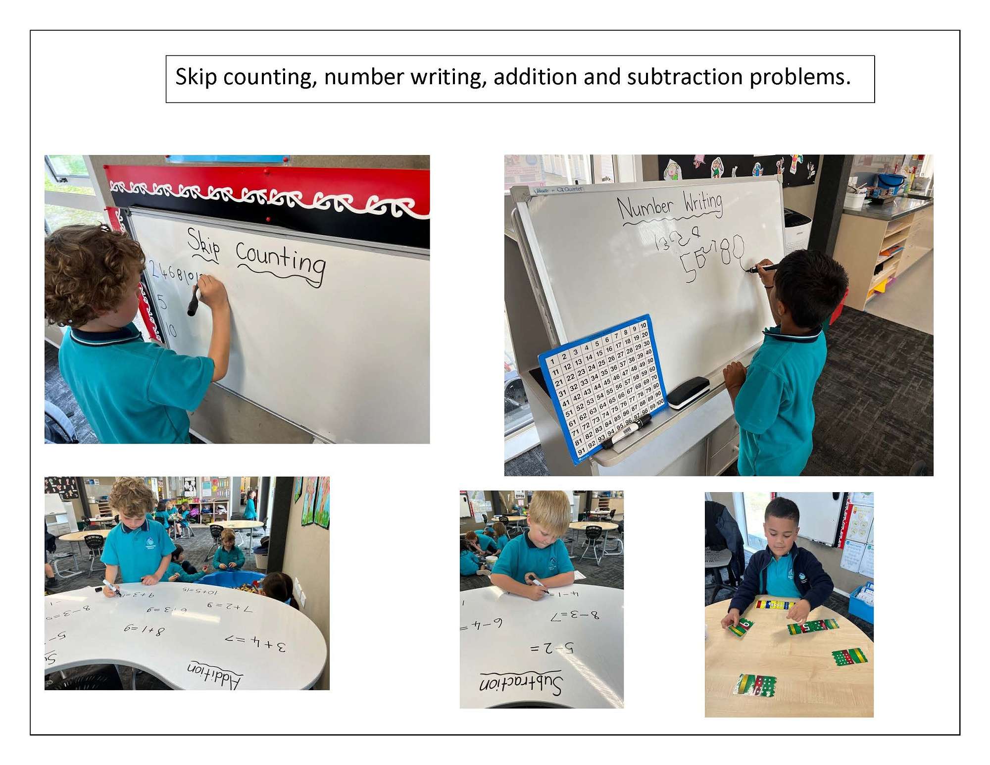 Photo by Hobsonville School Office Independent Maths Activities Elke Byrne - Y1 Teacher, H12 — November 10th, 2022 Shapes, skip counting, number writing, addition and subtraction problems... Image by: Hobsonville School Office Image by: Hobsonville School Office