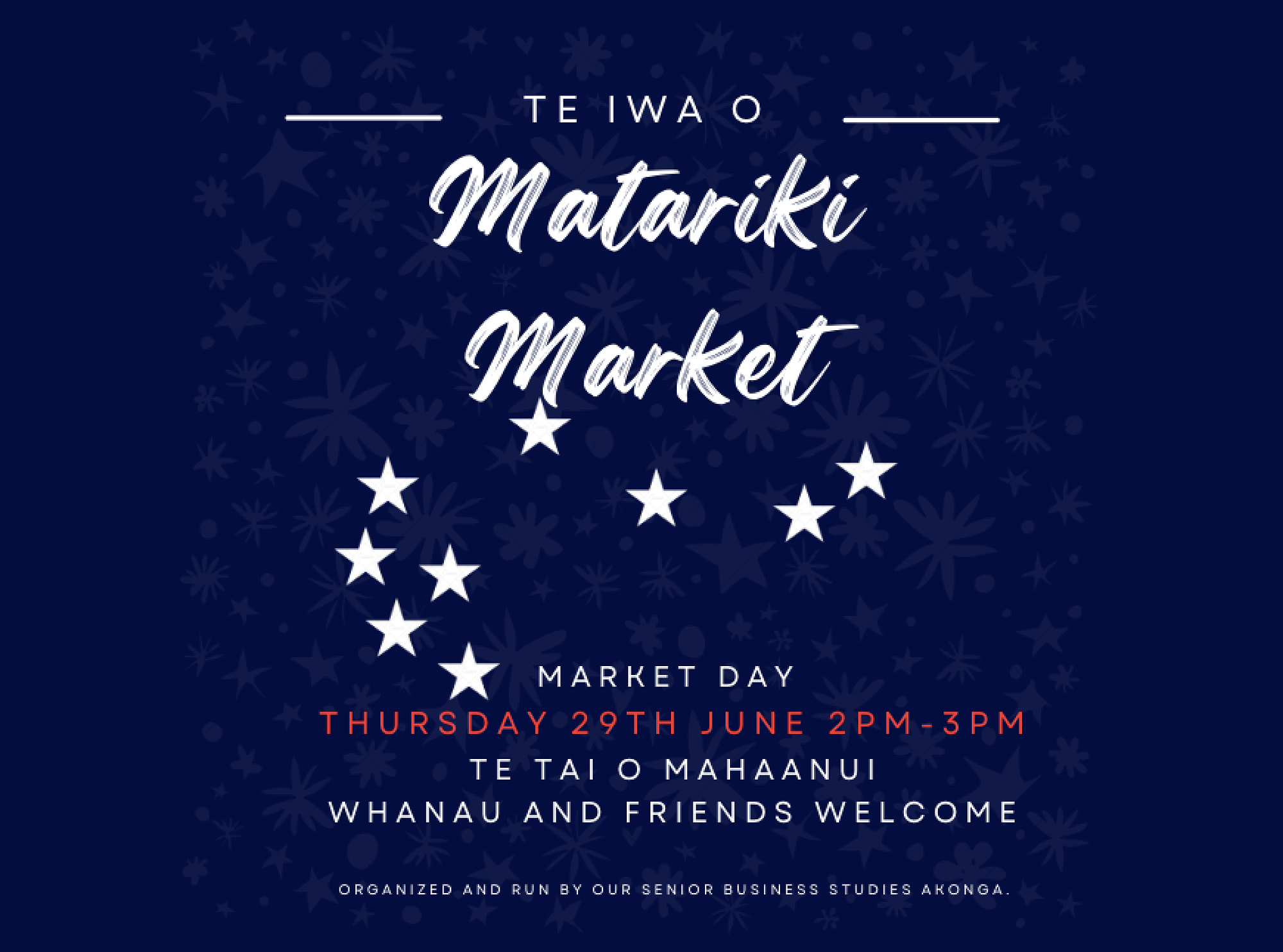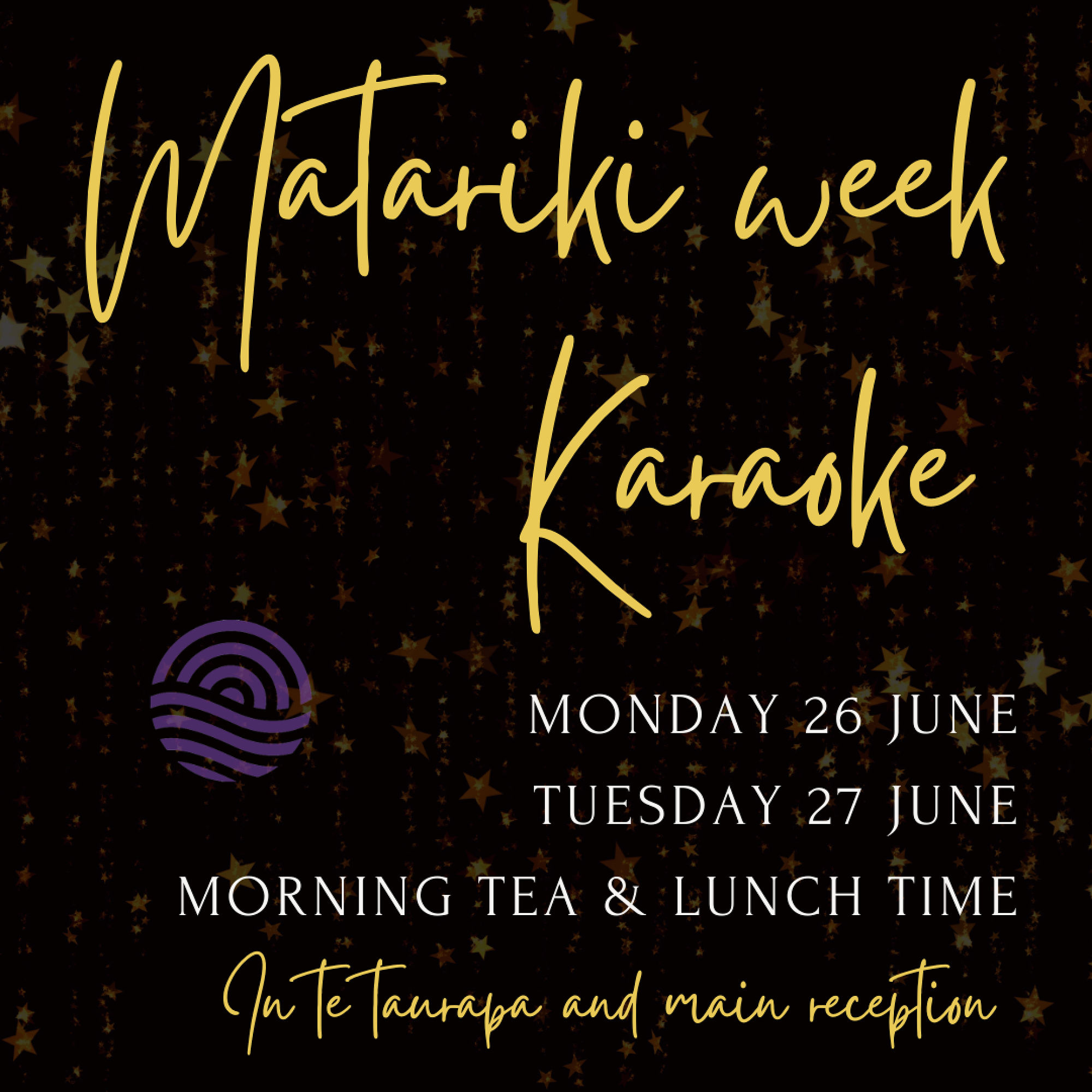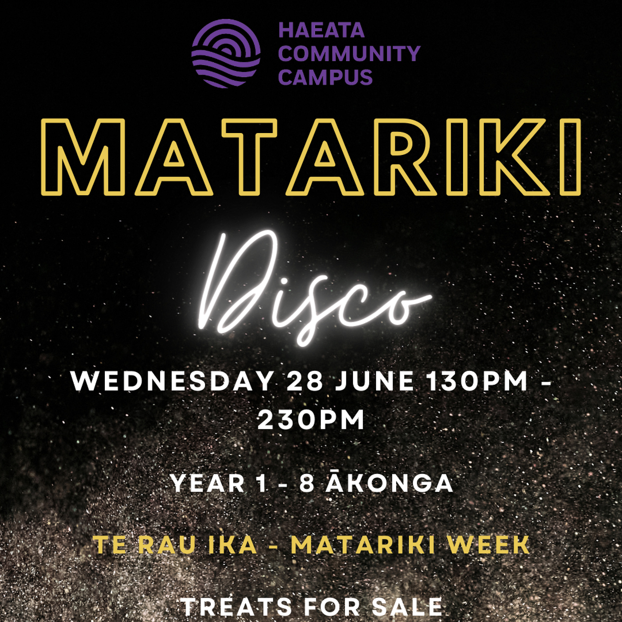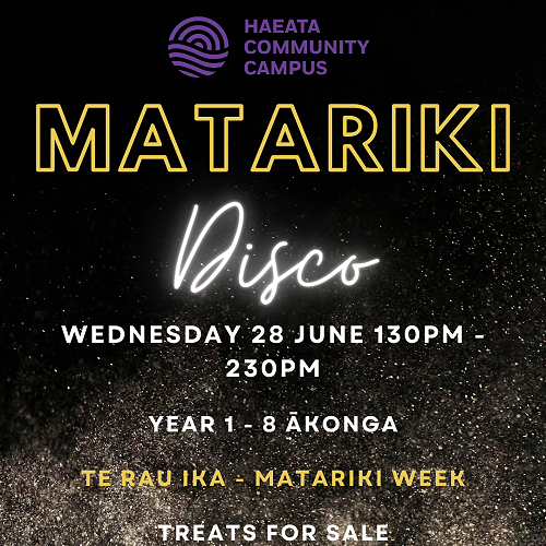 Kanikani Mai Ākonga mā Years 1 - 8. Dance the afternoon away to our Matariki Disco in Te Rau Ika 130 - 230pm. Treats for sale bring a gold coin