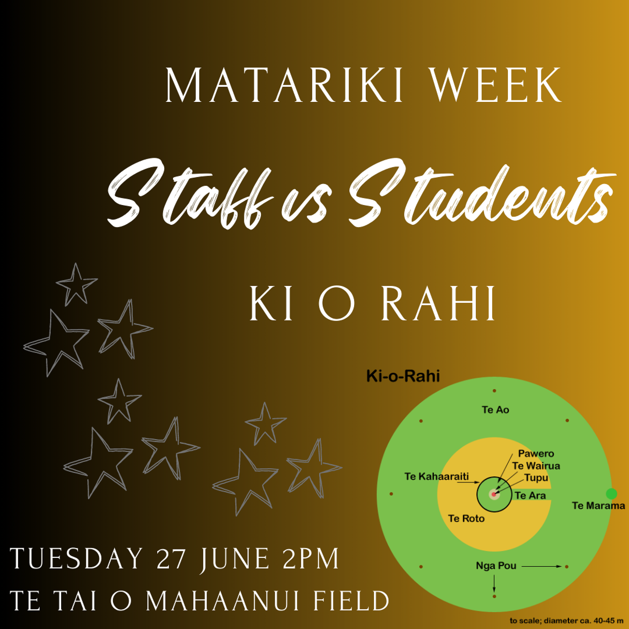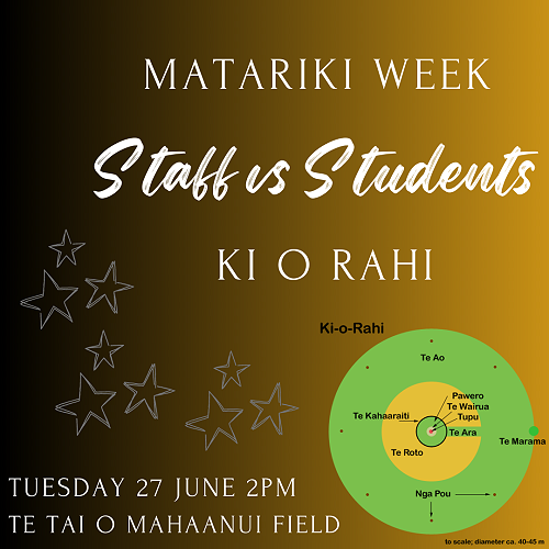 Come and wacth the Staff vs Students play Ki o Rahi 2pm Te tai o Mahaanui