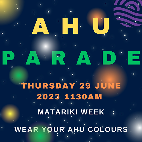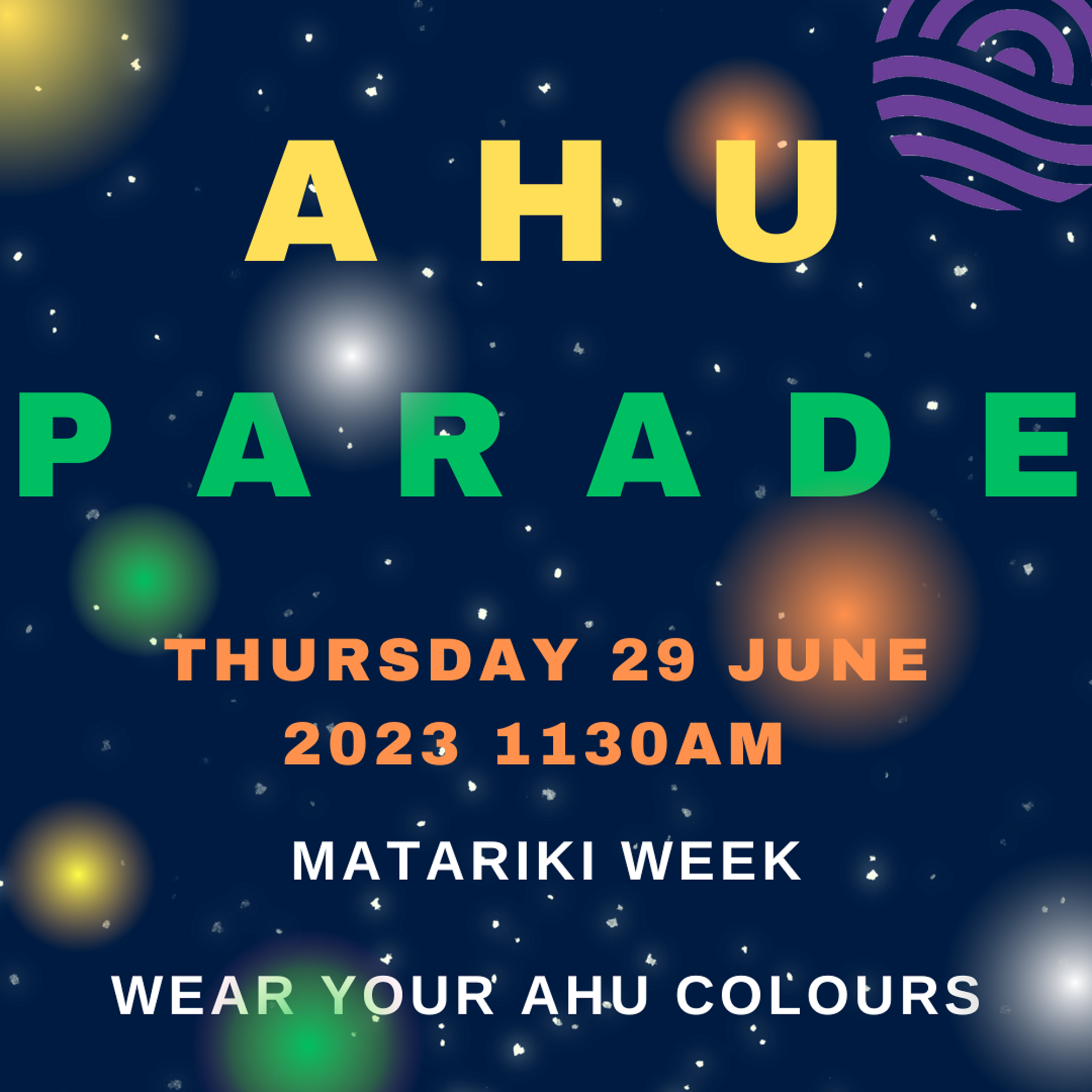 Wear your AHU colours for our Ahu Parade 11:30am Whānau welcome. Takawai Green! Manapou Yellow! Ōnewa Orange! Pākeho Black!