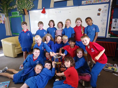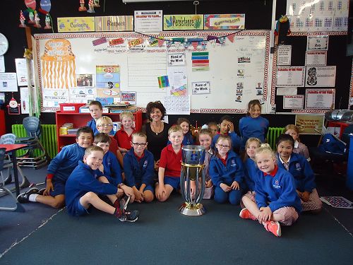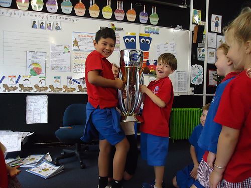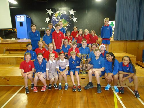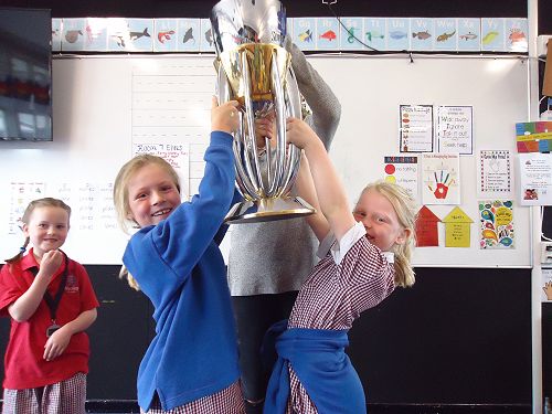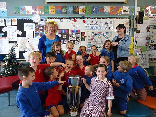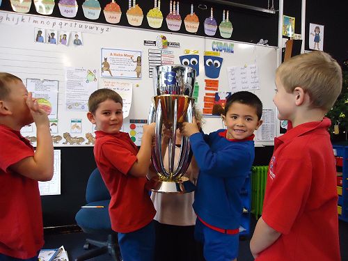 How cool.......The Super Rugby Trophy made a visit to our school. See some classes pictured below with it. Thanks to the Crusaders for letting it come to Hoon Hay School for the day. We discovered it is a very large and very heavy trophy!