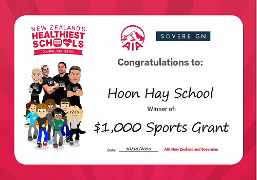 BIG SHOUT OUT to Rooms 4, 8, 15, 16, 18, 20 who took part in the Healthy Schools Challenge this term. Children have been stepping out kms with pedometers attached to their wrists, then recording distances online and walking around the world. Thanks to their efforts for participating, we have won $1000 to spend on new sports gear…how exciting!! There were 25 schools selected throughout New Zealand for prizes and we were one of them. Well done children and teachers for taking up the challenge and winning Hoon Hay School some new sports equipment. Thanks to AIA New Zealand and Sovereign for getting behind the challenge and providing the pedometers and cash grants.