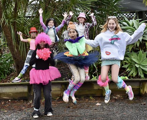 The whole school dressed up in mismatched clothes, lots of color and patterns with random wacky hair styles and lots of mismatched socks.
