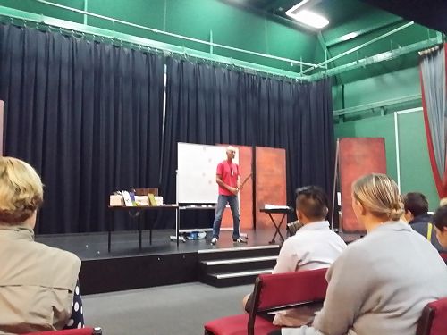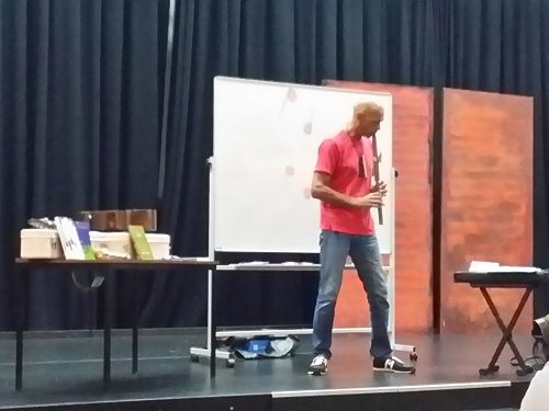 Poet and speaker Apirana Taylor entertained and inspired a packed auditorium for an hour with his mix of poetry, story telling, and music. His larger than life presence captured imaginations, and kept the audience of students young and old spellbound.