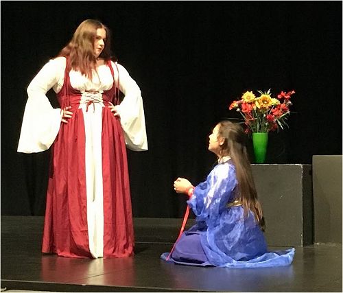 Once we were back at school teams worked very hard in breaks and after school to prepare for the filming and our end of term arts evening on 24 June. A group of talented, experienced Year 11 students, veterans of the festival having started in Year 7, tackled the challenging play 'The Taming of the Shrew' with Act 2: Scene 1 where the brash Petruchio woos the fiery Katarina. Managed by the ever efficient Molly Noven, assisted by Natasha Fry, the actors were Sam Rogers, Jessica Lilly, Nadia Officer, and Meagan MacKinnon. This rich characterization of these colourful characters created a complex and highly entertaining performance. Excellent work showing commitment, resilience, respectful team work and proud achievement.