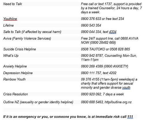 Outline NZ (sexuality or gender identity helpline) 0800 688 5463, http//outline.org.nz